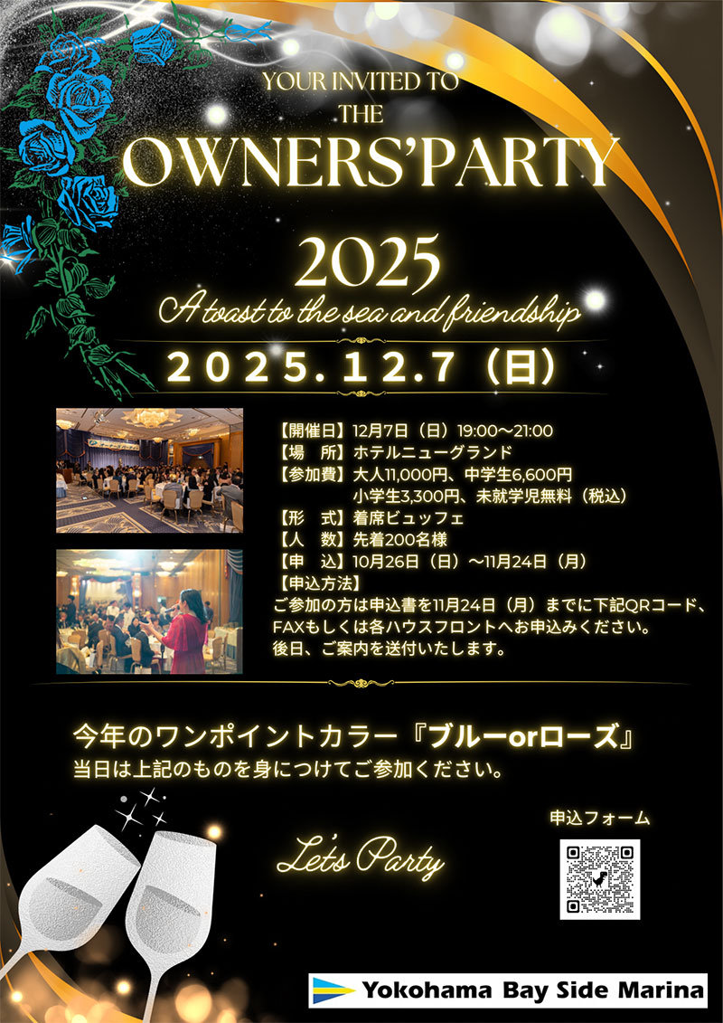 | 備考 | 【形式】着席ビュッフェ 【申込期限】11月24日(月)まで 今年のテーマカラーは”ブルーorローズ” 当日は上記のものを身に着けてご参加ください |