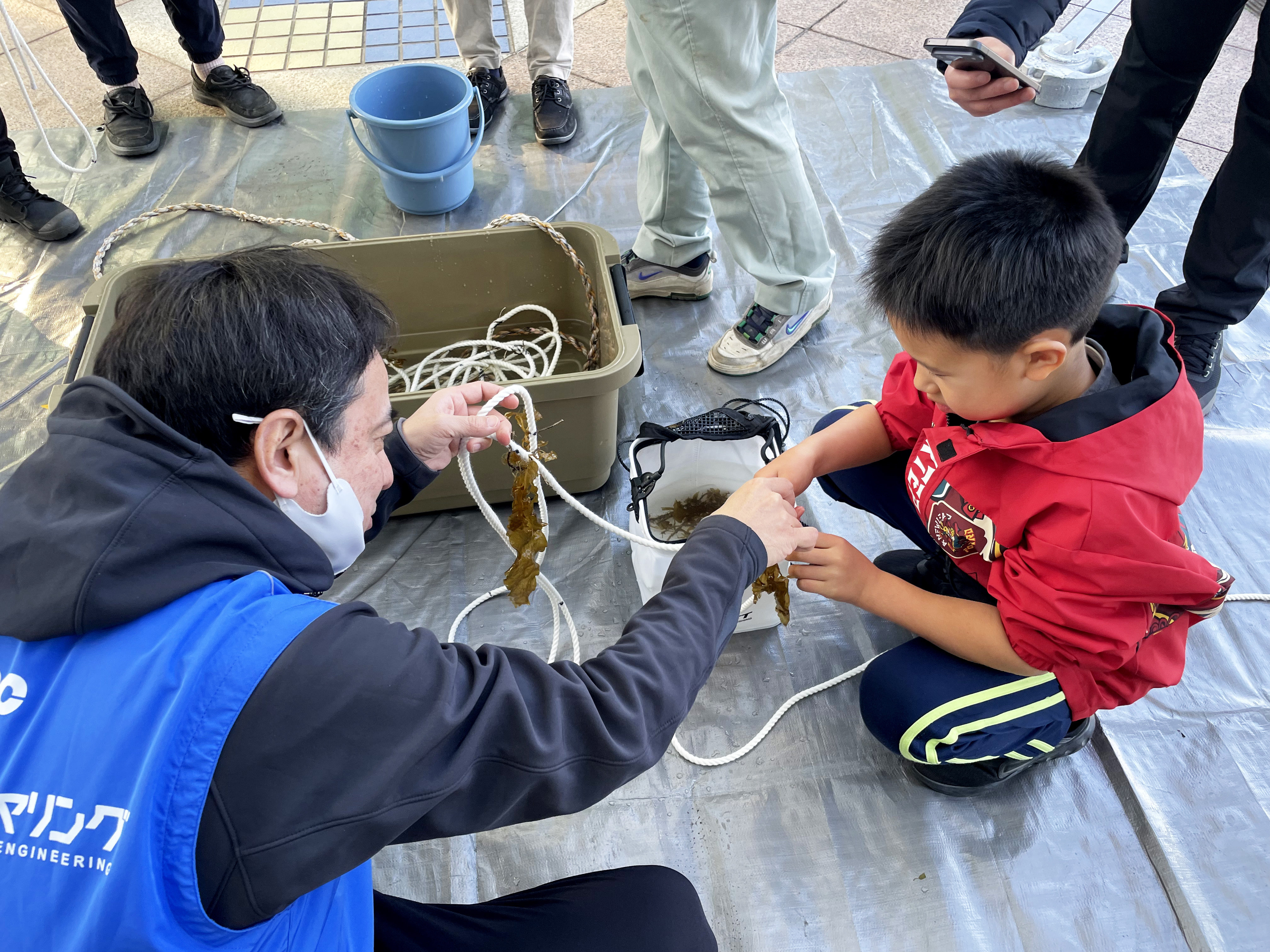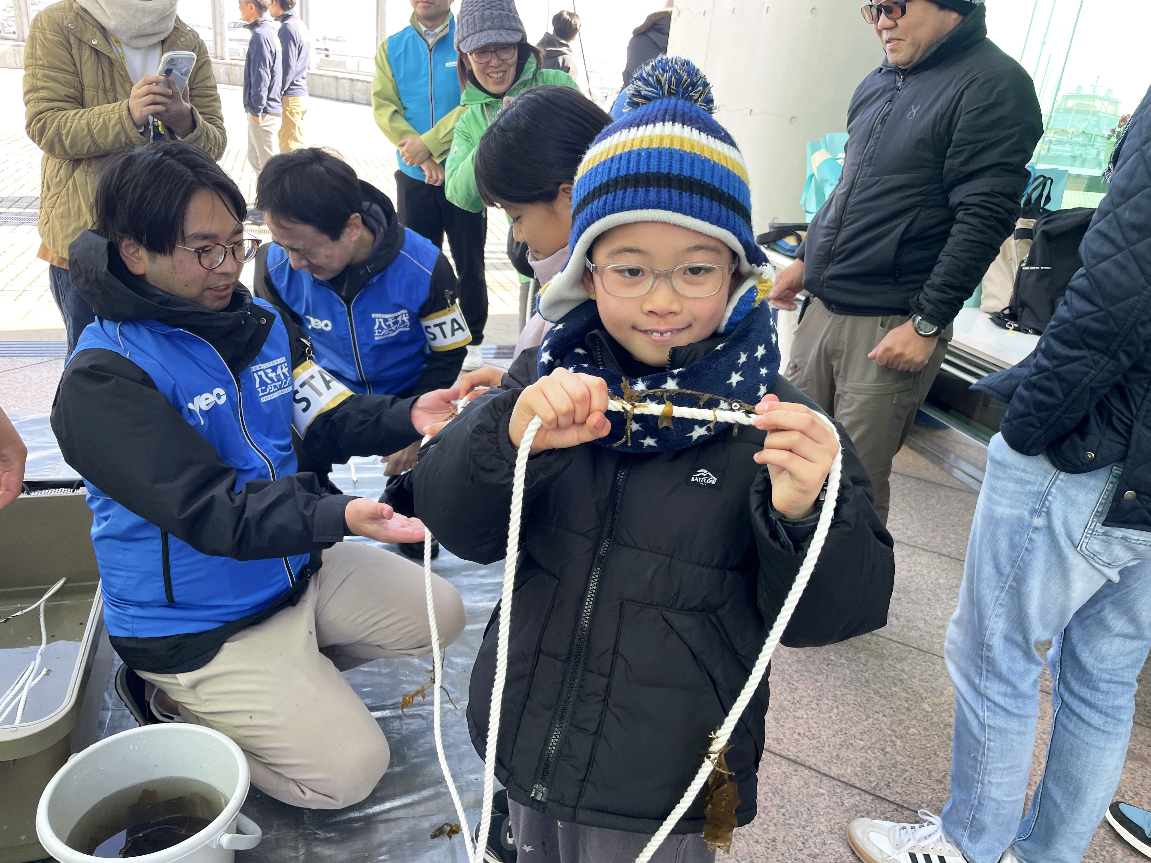 当日は、ブルーカーボンの仕組みや海ごみ問題に関する講義を行ったほか、子どもたちが自らの手で生育用ロープにワカメやコンブの種付けを行う体験プログラムを実施しました。参加した子どもたちからは、「成長が楽しみ」「収穫のときにも参加したい」といった声が寄せられ、環境への関心の高まりが感じられる機会となりました。